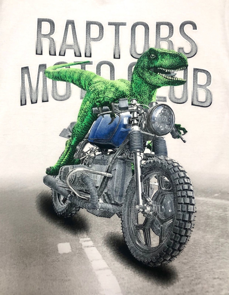 Camiseta branca basica com estampa na frente de raptor e moto
